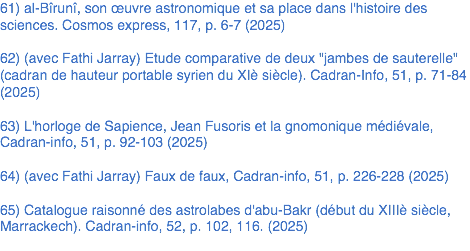 25) (Avec Fathi Jarray) Un cadran islamique problématique conservé à Sfax (Tunisie) ; Cadran-Info, 36, p. 88-96 (Octobre 2017)